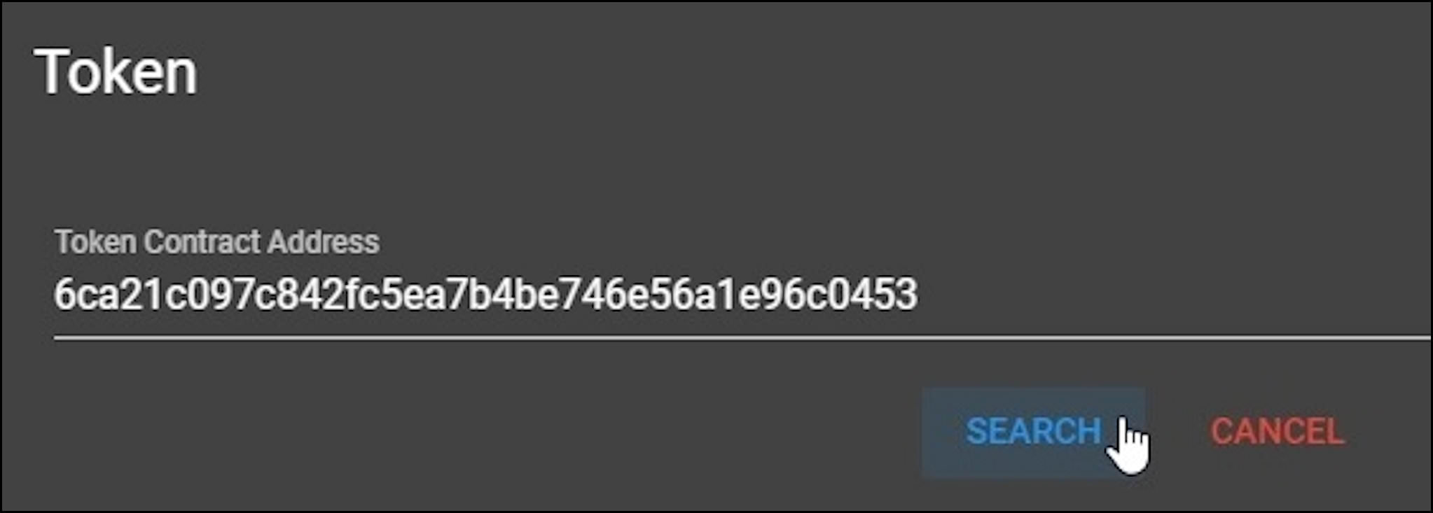 Paste the Address Hash copied from the Explorer into the Token Contract Address field and click the blue SEARCH button.